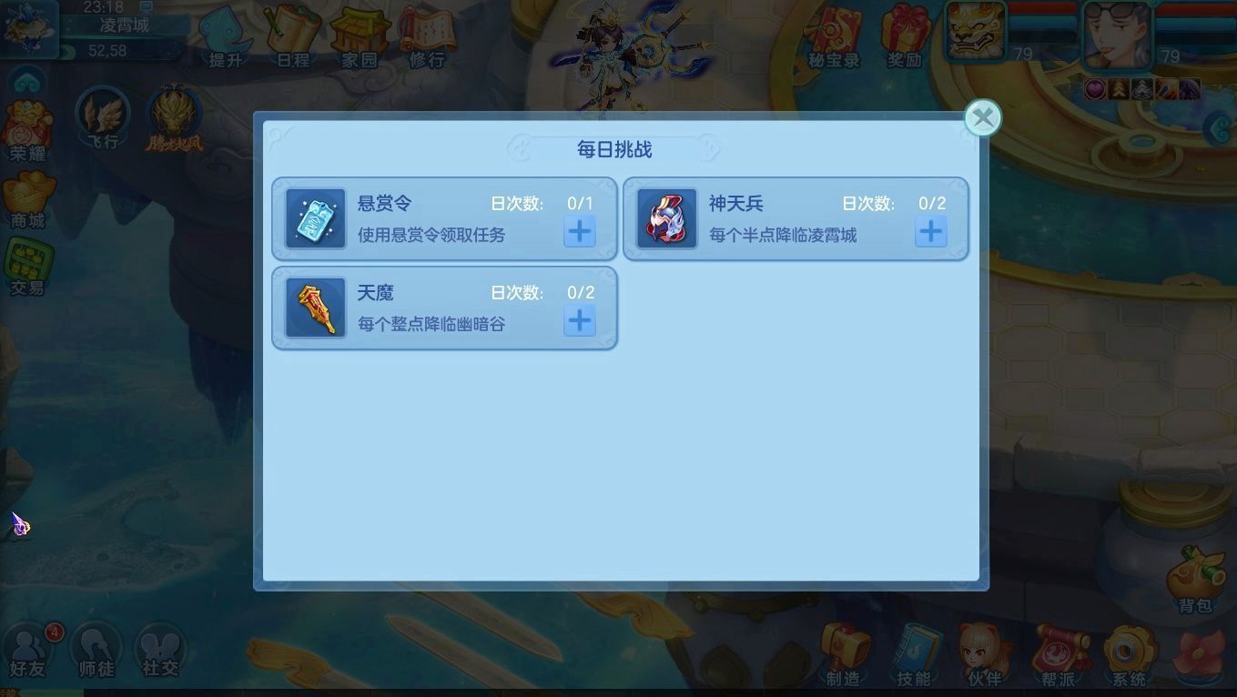 组队任务:天界的神天兵半点降临凌霄城,奖励和难度随着星极增加。你可以组建一个5人队伍前往挑战,成功击败神天兵后可以获得道具奖励,每日可以获得2次奖励。