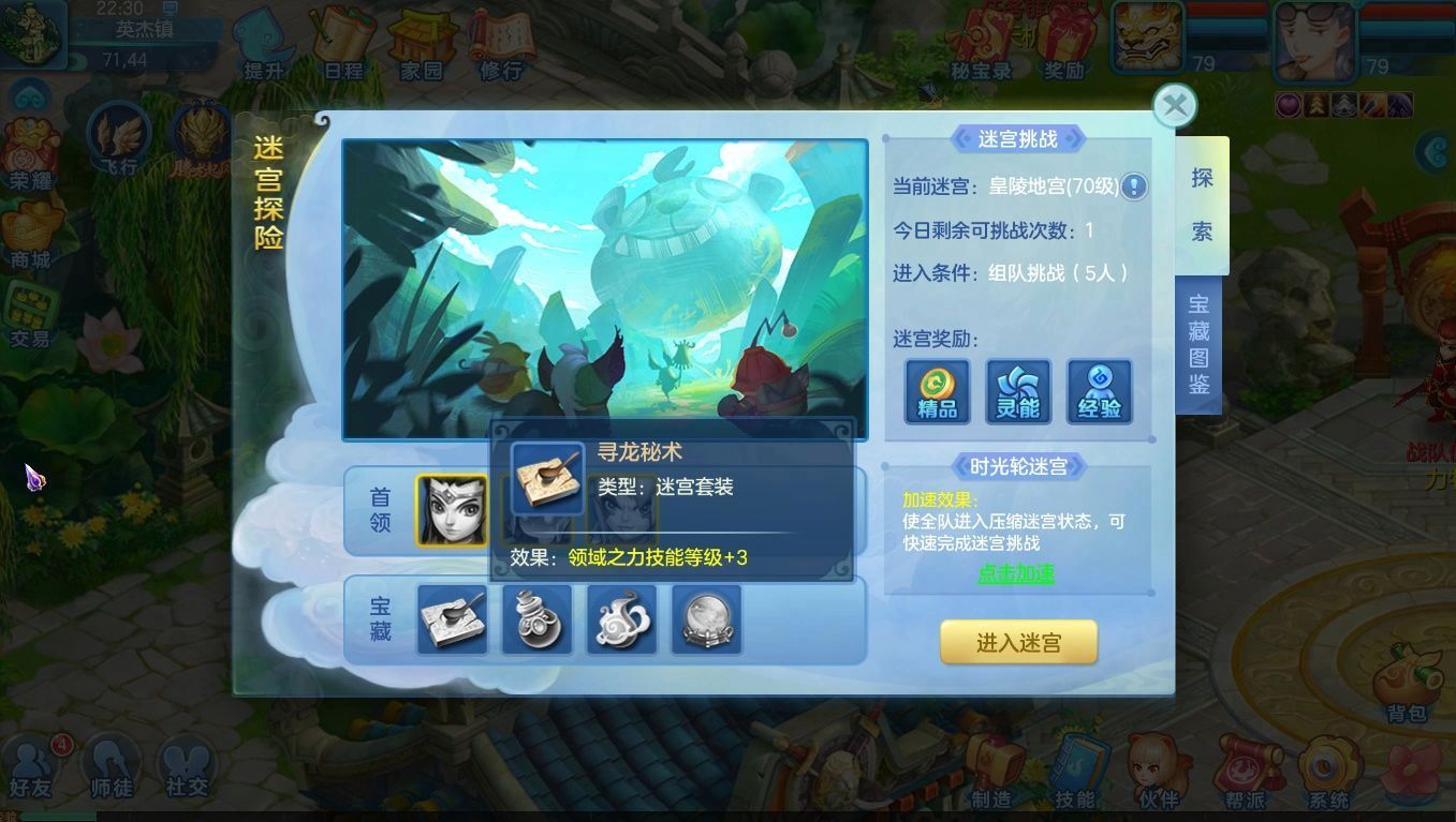 9、迷宫(梦想币、冒险积分):每天只可挑战一次,在迷宫中击败怪物有机会获得宠物碎片、宝图碎片、天赋秘籍等。另外迷宫还有一套宝藏系统,收集宝藏碎片合成套装可以触发额外效果,后期将会发挥巨大作用。