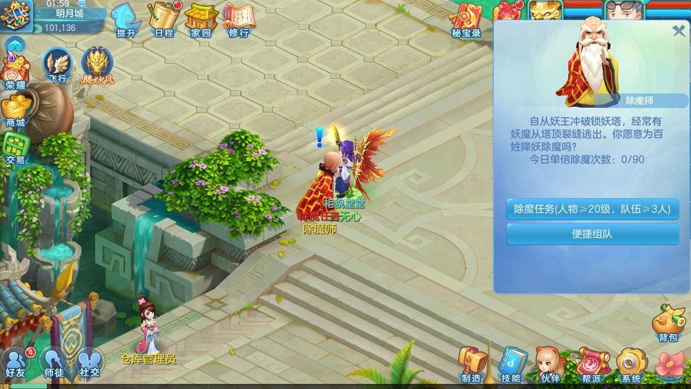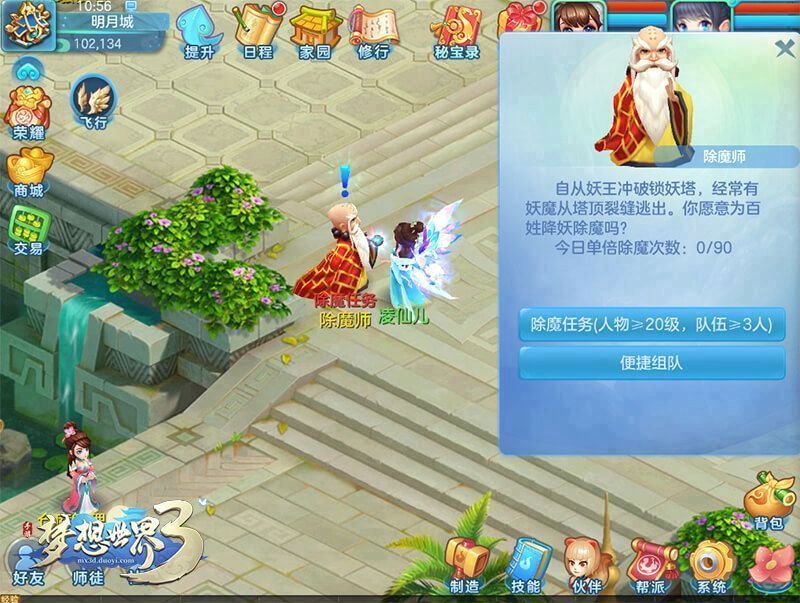 组队任务:找到明月城的除魔师领取任务。消灭妖魔可获得经验、物品奖励。人物头像下方的当前状态处可以领取双倍点数,获得更多经验,升级更快。