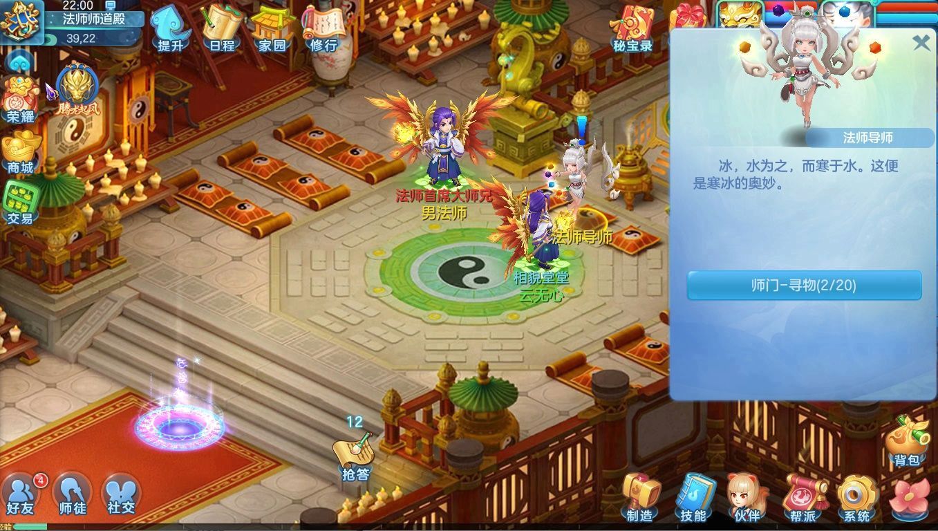 进入师道殿拜见各职业导师,完成导师吩咐的任务,可获得人物经验、宠物经验、招式经验等奖励。