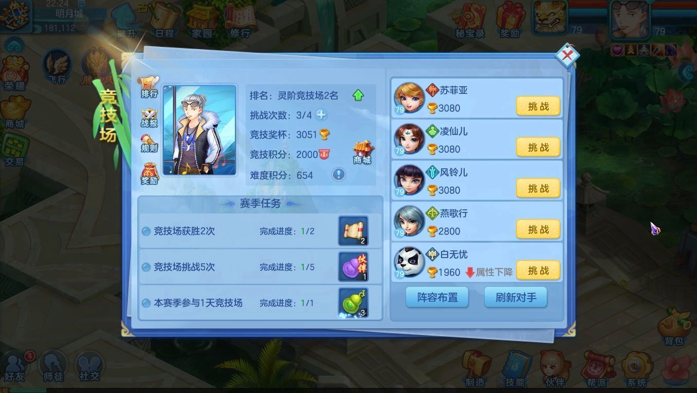 5、竞技场(经验、竞技积分):每天可以免费挑战竞技场4次,另外可以通过花费5万银两购买一次挑战次数,一天最多购买四次。挑选合适的对手对战并获胜,可以获得经验和竞技场积分,存下来的积分可以兑换飞翔之羽换翅膀、兑换宝石包镶嵌石头、兑换宝图手册挖宝等,除此以外完成赛季人物还能获得宝图、修炼果、伙伴修炼果等奖励,奖励还是很丰厚的。
