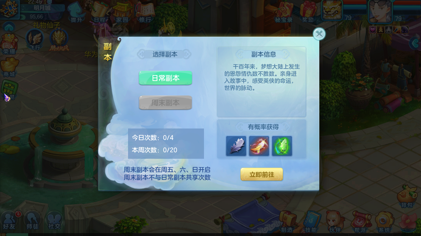 6、副本(梦想币、经验):副本是回合制游戏最具特色的玩法,需要组队通过,可进行本服和跨服匹配队友,每天4次(服务器等级≤45时每天2次)能获得梦想币和经验,周五到周日还可以进行总共4次难度较高的周末副本(服务器等级60时开放)。