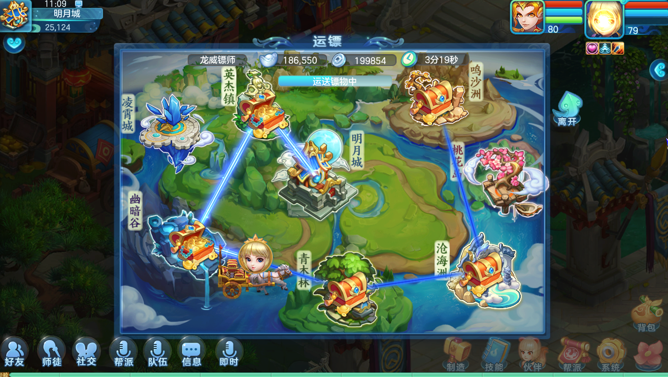 4、运镖任务(银两):每天可完成1次。通过固定路线,在运镖过程中会遇到明雷怪物,运镖可以获得银两、伙伴修炼果等,是银两的主要来源之一,除此以外还有一定概率获得阵法。