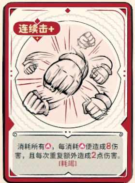 1、除了葡萄弹,其实还有一张连续击也是有用的牌,它的升级价值很高,不升级是没有 每次重复额外造成2点伤害 这一句的。