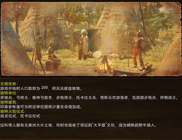 苏族是游戏里的骑兵民族之王,前期拥有速度优势的骑兵配合酋长可以骚扰对手,而后期种类繁多加强卡全面的混编骑兵又拥有强大的作战能力,是唯一可以纯骑兵作战的民族,当然苏族的步兵实力也不差。苏族是大平原上的优秀猎人,拥有打猎速度的加成,并通过主城和升级获得大量野牛,提供丰富的食物来源,但其他经济加强卡极度匮乏,后期经济实力垫底。苏族的印第安帐篷虽然不提供人口,但打卡后可以增加附近部队的生命值和攻击力且效果叠加,使得苏族阵地战同样威力强大。
