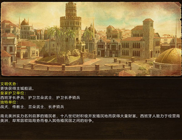 曾在《帝国时代2》里擅长热兵器的西班牙,却在《帝国时代3》里变成擅长冷兵器的国家。这符合西班牙曾经在新大陆刚发现时辉煌无限,但工业革命后逐渐变弱的历史事实。因为是传统海上强国,所以发达的海上运输使得殖民地能够快速的从主城获得支援,让西班牙在前中期的战斗中处处争先。西班牙冷兵器异常发达,特色兵种剑盾手一度辉煌但现今无力;枪骑兵的长矛能对所有步兵构成强大杀伤;还能训练欧洲唯一可帝国的长枪兵。此外西班牙的传教士能给部队带来强大的攻击力加成,虽然是医疗者但在后期非常强大。