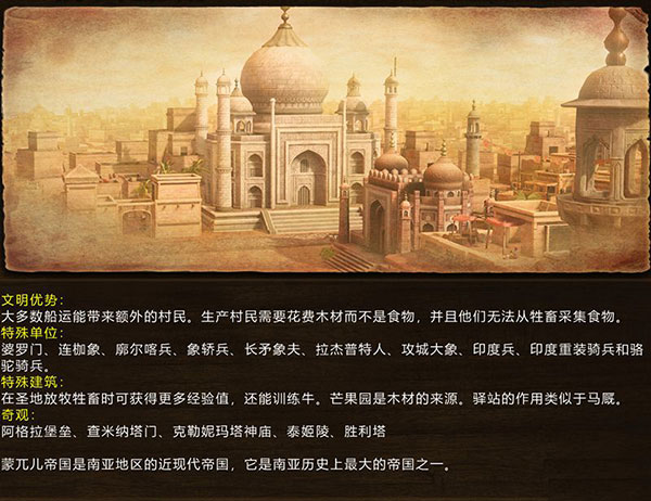 印度是堂堂四大文明古国之一,在历史上也是统治整个南亚次大陆和中亚沙漠的强大帝国,在《帝国时代2:被遗忘的帝国》中一度出现。帝国时代3中的印度已不复往昔的辉煌,成为英国的殖民地。游戏中的印度农民需要木材而不是食物,但是拥有伐木科技上有一系列加成和船运卡片,并且基本每张卡片都会送一个村民,使得印度前中期经济实力反而不俗。印度殖民时代即拥有即可出兵也可防守的阿格拉堡垒作为第一个奇观,殖民兵种异常全面,火枪散兵近战骑兵远程骑兵一应俱全而且性价比均很高,使得印度殖民大战非常强大,一跃成为帝国3里最强大的国家之一。堡垒时代印度又拥有昂贵但威力惊人的战象军团,以及从主城运送、近战反重步的软剑兵,同样是同类兵种中的佼佼者。值得一提的是从主城运送的软剑兵,属性相当于散兵但却近身作战,但是血多攻高攻速快有范围溅射,几乎吃定所有其他步兵,是强大的步兵兵种。印度的建筑风格在一开始不是很引人注意,但进入殖民时代后出现了圆顶和廊柱等等一系列的伊斯兰风格,直到升到工业时代後建筑的白瓦金鼎显得异常金碧辉煌。因为和中国、日本的文化相差甚远,使印度成为亚洲王朝中最与众不同的文明。