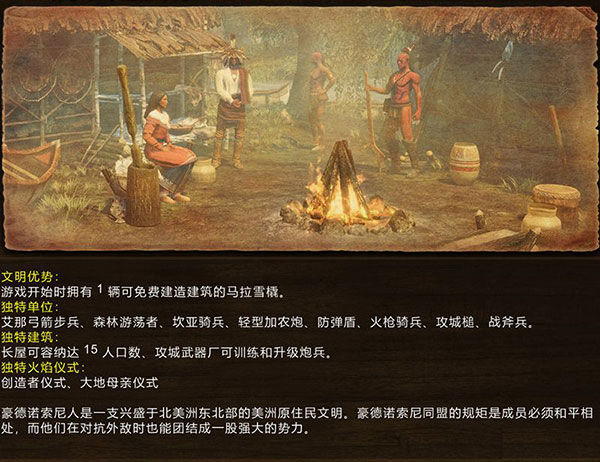 独特部队:艾那弓箭手、掷斧兵、坎亚骑兵、轻型加农炮、森林徘徊者(隐身散兵)、攻城锤、易洛魁盾牌手