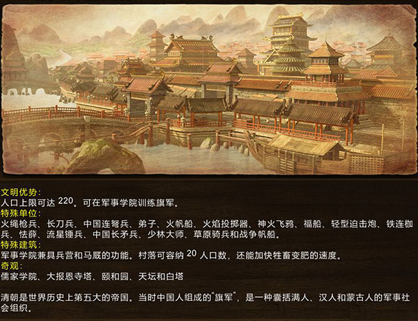 独特部队:诸葛弩、中国长枪兵、草原骑兵、怯薛、连枷骑兵、流星锤骑兵、火绳枪手(散兵)、长刀手、火焰投掷器、虎蹲炮、神火飞鸦、满洲骑射手(佣兵)、明朝铁军(佣兵)、少林藤牌手(佣兵)、福船、火帆船