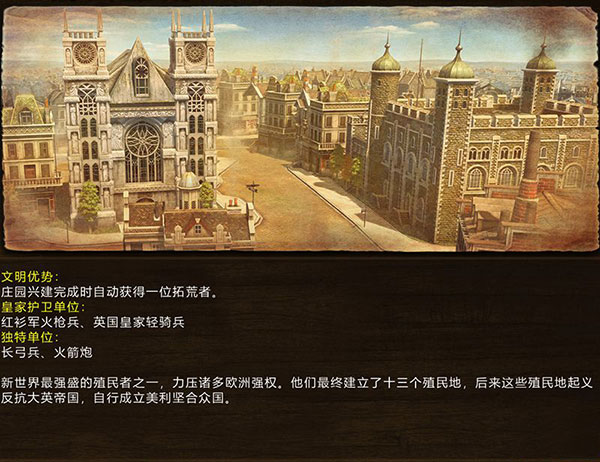 英国是工业革命的发源地,靠着海盗打垮日落西山的西班牙后成为第二个日不落帝国,又在英荷贸易战中击败劲敌荷兰成为环球贸易帝国,在七年战争重创世仇法国取得北美、澳洲、印度等超大面积的殖民地,成为名符其实的日不落帝国。游戏中的教学就是用英国最为模版来教导初学者。英国的特点是军事、经济两不误,造房子快速生产村民往往使得前期经济瞬间大爆发,是帝国3中著名的经济强国之一;红衣火枪是帝国3中最强大的火枪手,拥有一系列加强卡和教堂科技加成,可以将英国的军事优势一直保持到工业革命前。英国还能逆向致力于发展曾在中世纪出现的长弓手等。在英法百年战争中大显神威的长弓手可以攻击百年后的法国士兵和日本弓箭手。