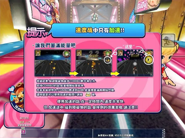 即速度竞赛,看谁最快到达终点。在游戏的过程中,随着 COMBO 的增多,可以看到右方的加速槽颜色由灰转慢慢转黄,等到整个加速槽变成黄色,按下 CTRL 即可加速,同时左下角滑稽的动作和升高音调加速的音乐也让人忍俊不禁。加速是有时间限制的,也就是过了加速的时间要重新积累 COMBO 数;另外如果跌倒了,损失可比没加速还要严重。