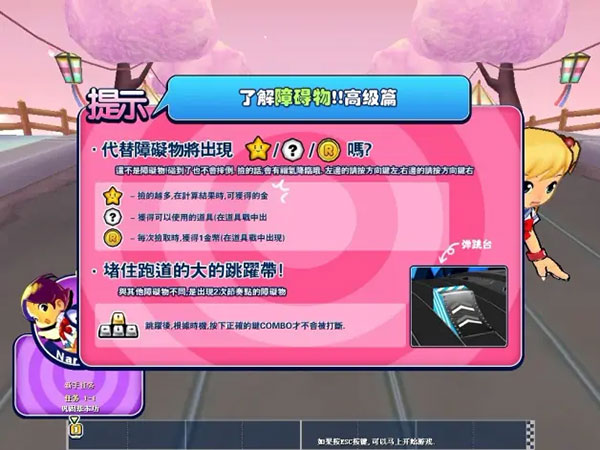 左上:跳过左边的滑杠障碍;长按可以躲避左边延长型的滑杠障碍