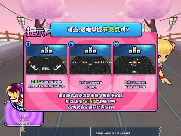 12、什么时候按键呢?音游当然要的是“恰到好处”,所以,在俩节奏点刚好相撞的时候按吧!换作角色而言,就是障碍物到跟前,碰到角色的那一瞬间按,是最好的。