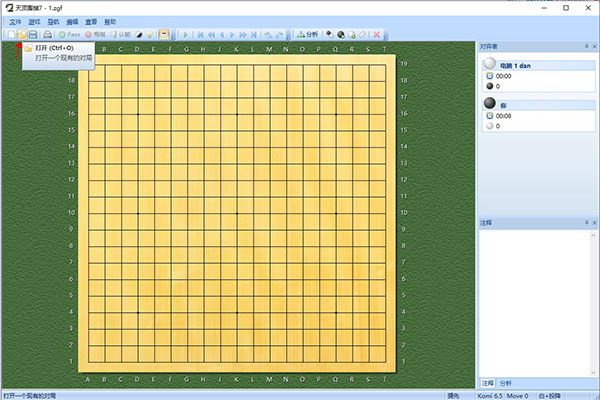 1、天顶围棋7的复盘操作很简单,首先点击上方【打开】,然后选择棋谱文件,软件支持zgf、sgf、gib这三种棋谱文件,其中zgf为天顶围棋专用的棋谱格式。
