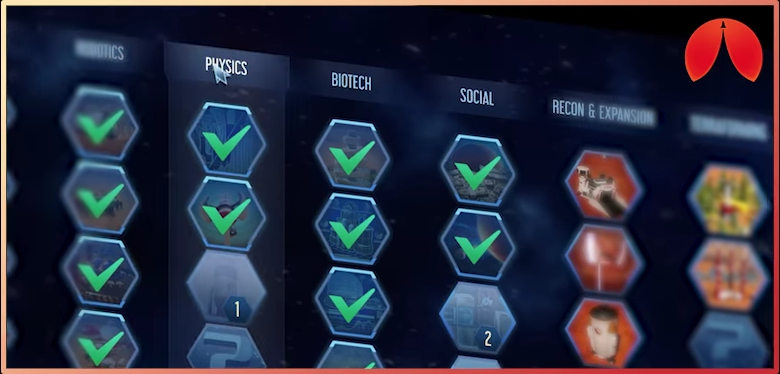 技巧提示:建造研究实验室,并寻找能够提升科研产出的赞助商/特性;如果侧重于经济发展或出口,可以考虑外包研究。通常情况下,一个配备研究站点(地图上蓝色灯泡图标)的研究穹顶,内设3个霍金实验室和3个研究实验室,并安排2-3个班次和高强度的工作量,大约可以在100-150个太阳日左右解锁。