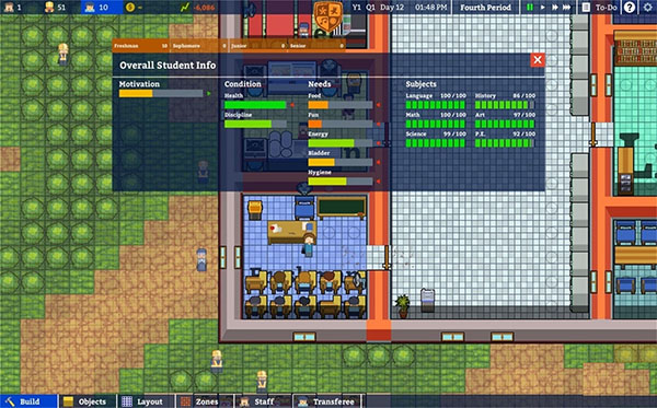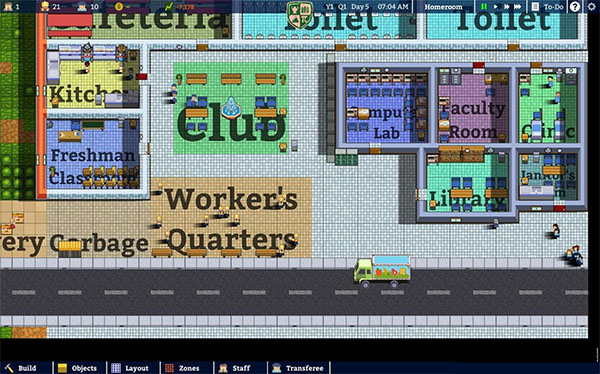 开局时的建设只要达成基础教育任务的要求就好,第一批学生数量取决于你在教室内安置的学生椅数量,因此不能招太多。不过没关系,我们可以等一波转学生啊。游戏内是每五天就可以到达一批转学生,因此我们可以在底部菜单栏的转学生许可面板(Transferee)设置一下转学生数量。要设置多少呢?当然是越多越好啦!一个学生可以带来每天$100的收入,那么200、2000个呢?可以设置的转学生数量是无上限的,但是请务必记住,一旦招生,就不能指望像辞掉员工一样开除学生(勒令退学?不存在的!),只能等到他们高四毕业,所以到底招多少学生,取决于玩家日后的打算(是否愿意把旧校舍全部拆除建立新校舍、是否愿意建立十几个甚至更多的班级来管理他们等等的诸多问题)。有利就有弊,额外的学生将因为没有教室而到处溜达,成绩自然也是咸鸭蛋。不过玩家可以在日后有钱时重新打造校园管理他们。总之,是想要细水长流还是当回暴发户全凭玩家自己考量。