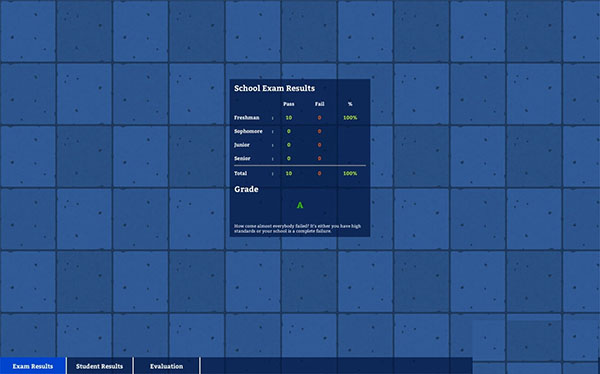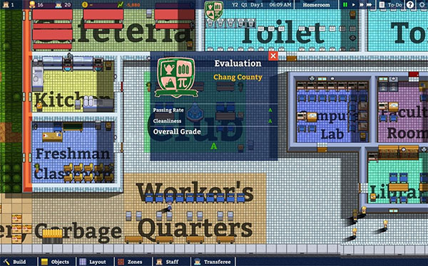 评估系统共分为A~F的6个等级(可点击游戏界面正上方的校徽按钮查看),该系统可分为三个方面——通过率(Passing Rate)、清洁度(Cleanliness)和整体评估(Overall Grade)。其中,通过率由学生们的期末考试成绩来评判。因此,刚开始游戏的时候,玩家的通过率自然就是从最低的F级开始。而清洁度的评判则主要取决于你在开始时建造的校园的外观。通过率和清洁度则是关乎到整体评估的标准。