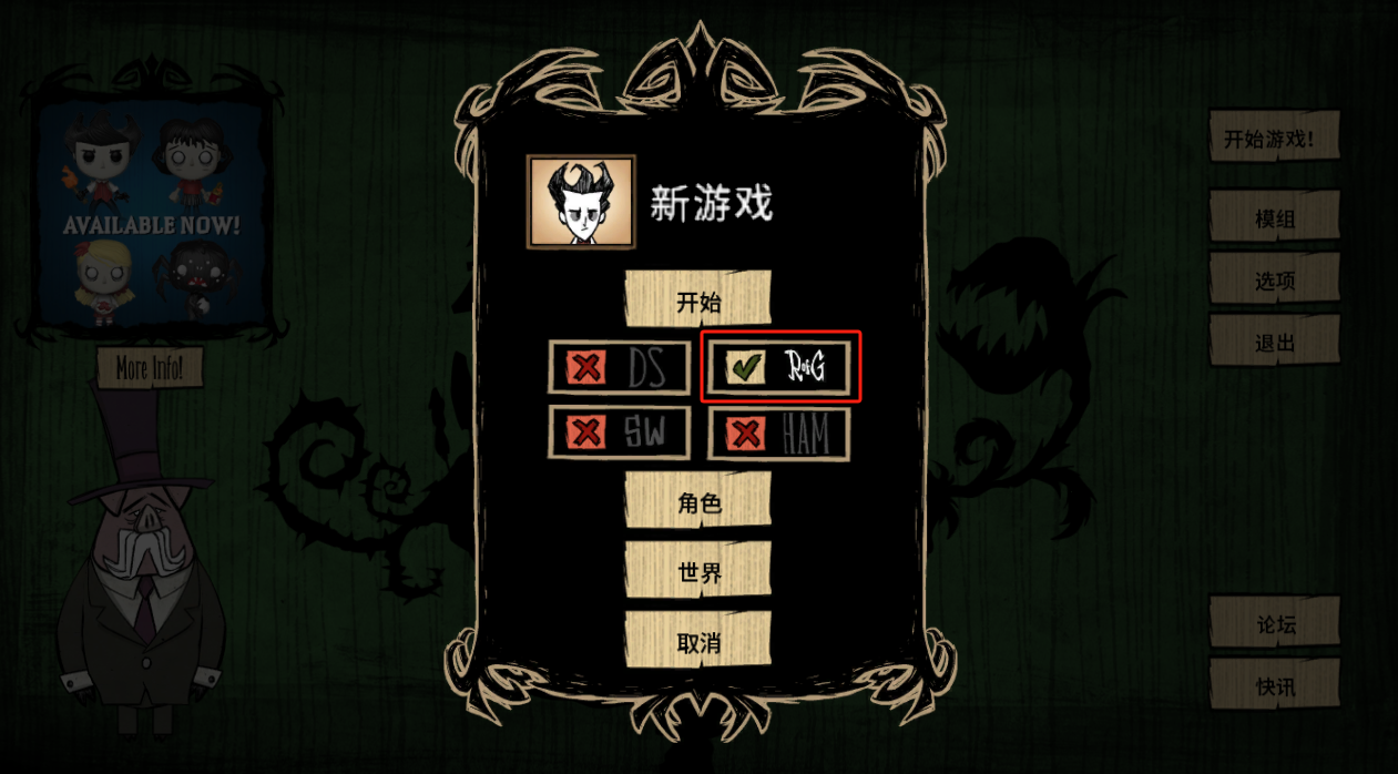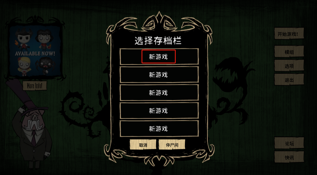 玩家可以根据喜好选择不同的角色,比如威尔逊适合冬季探索,火女砍树快但精神值低,温迪幽灵前期很强势但血少攻低,沃尔夫冈攻击力高但容易饿,机器人前期弱后期没用,麦克斯威尔分身好用但过后期属性低,薇琪自带科技但冬天恢复精神值困难。