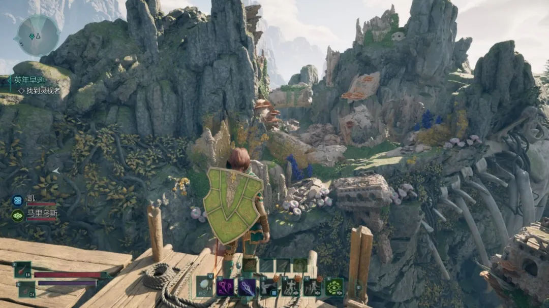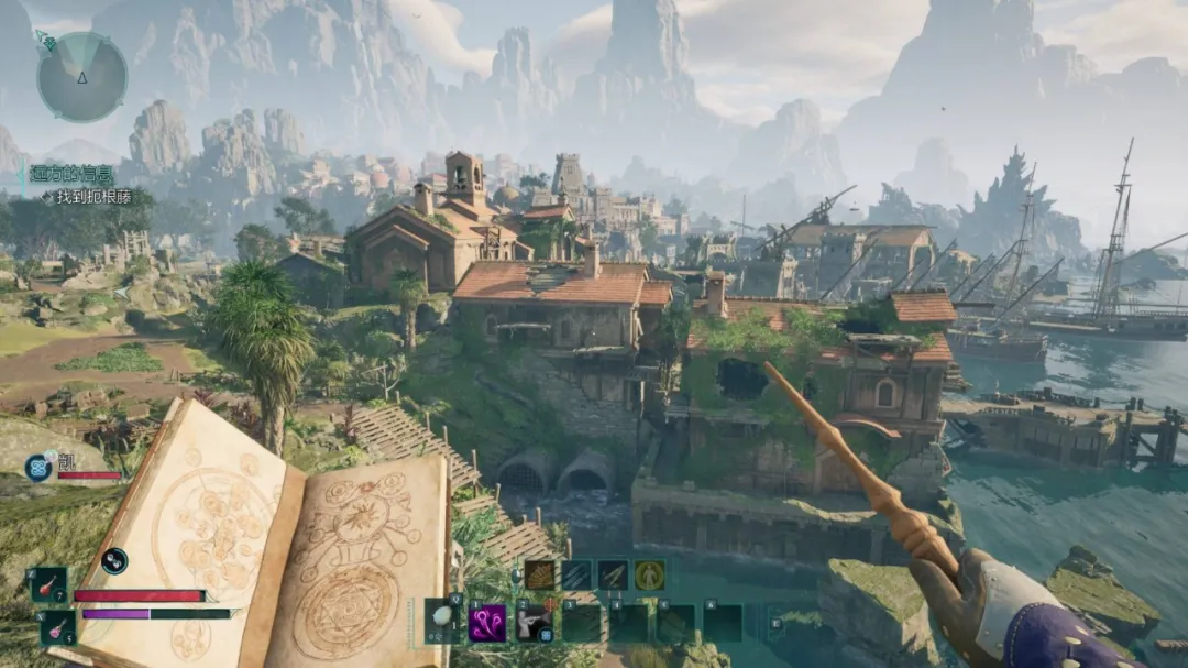 《宣誓》的世界由四张大型箱庭地图组成,每张地图都有不同的视觉风格,也有一些中小型的洞穴和地牢的入口藏匿在大地图中。相比《天外世界》那种枯燥的平铺式地图,本作的场景设计有了显著进步。地形结构不仅有足够的立体感和纵深感,隐藏要素也多得让人有些眼花缭乱。刚刚进入游戏第一章的码头区域,我就乐此不疲地在房顶之间跳来跳去,花了半个小时寻找各种宝藏。