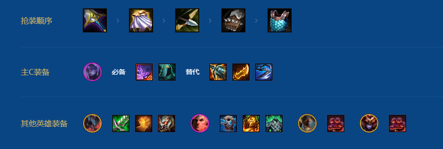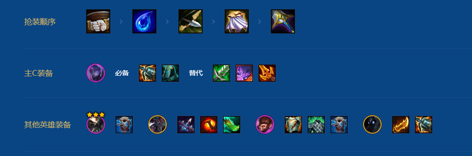 装备分析:主C芸阿娜,副C丽桑卓,瑞兹给其他的辅助功能装备。前排装备给孙悟空,有多余的肉装给塔里克。