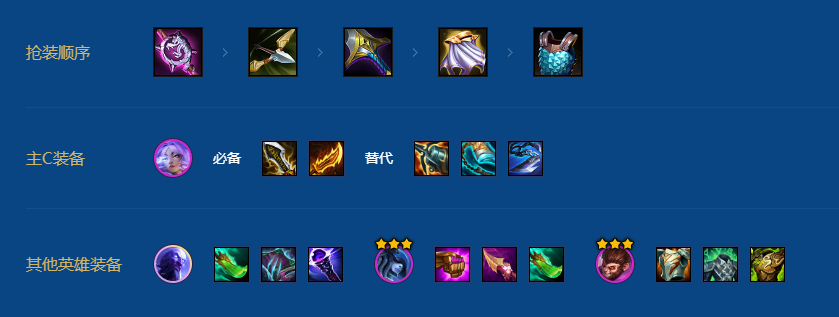 装备分析:卑尔维斯必备海妖和水银,第三件需要吸血,有暗裔之弓最好没有的话伤汲取剑。前排谁先2星就给谁装备,孙悟空和峡谷先锋都行,必备振奋铠甲和石像鬼石板甲。第三件如果功能装能通过后排做出来那就优先圣盾使的誓约。如果后排做不出来可以用日炎或者薄暮。