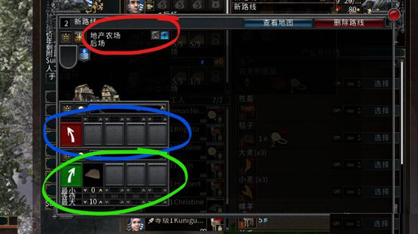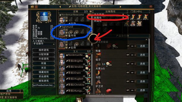 点击红圈内的“新路线”三个字,不要点右边的图标,会重新规划路线的。点击新路线后,会出现红色箭头指的图标。然后移到篮圈内的运输人员处,点击左键,点击完之后你会发现人物头像右边的三个图标最下面的车轮图标亮起,这样就成功了。前提是你的运输人员要在你的农场里。