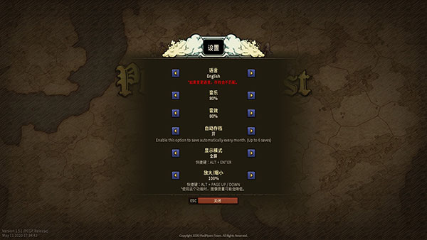 4、然后在设置中,可以调整游戏的语言、音乐音量、以及自动存档;