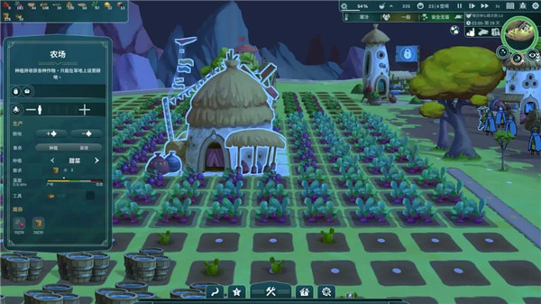 我们初始拥有16名村民。游戏也提供了1倍、2倍、四倍速功能,还有着详细的新手文字教程。第一件事便是伐木建造帐篷供村民休息了。巨兽的背上会缓慢长出莓果,采莓坊可以作为应急的低效食物获取方式。接着要给建造农场,并给他盘下一片地,随后可以安排至多五人在该农场劳作,低温下可以优先种植甜菜。种植作物需要水,贮风井在寒冷地带可以自动收集露水,有三四个贮风井再配套两个储水塔就可以支撑三四片农场的满负载运作了。资源堆积处和食品储藏库也要紧跟着建造作为低级仓库。