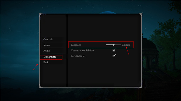 3、进入options选项,打开language设置,拉动设置条设置成为“Chinese”即可设置为中文。