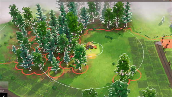 注意伐木屋也是有工作范围的,如果范围内的树木都已经砍伐了,那伐木屋就没有工作的动力,所以前期要放到树木聚集的地方。