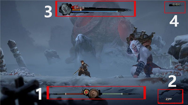 红色凹槽为生命值,白色凹槽为耐力值。两个凹槽之间为当前技能,在战斗中,你可以进行技能间的切换。