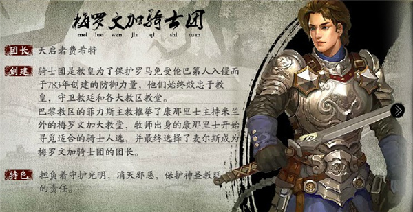 创建:骑士团是教皇为了保护罗马免受伦巴第人入侵而于783年创建的防御力量,他们始终效忠于教皇,守卫教廷和各大教区教堂。 巴黎教区的菲力斯主教推举了康那里士主持米兰外的梅罗文加大教堂,牧师出身的康那里士开始寻觅适合的骑士人选,并最终选择了麦尔斯成为梅罗文加骑士团的团长。