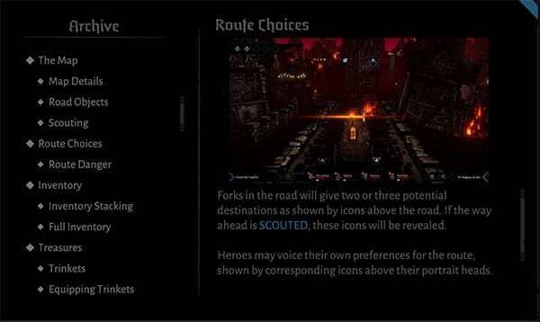 路上的分岔口会给出两种或者三种可能的选择方向,会通过标记展现在对应的道路上,如果道路侦察过,标记就会被展示为目标的标记,当你走上一条路时,这条路的终点是什么也会被在你的地图上标记出来。