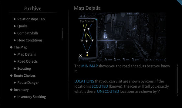 小地图展示了据你所知你的道路前面有什么,你可以访问的地点会通过标记展示,如果这个地点被侦察过了,标志会展现出它到底是什么东西,如果没有被侦察的话,会显示出一个?