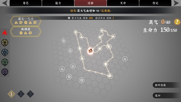 没有天命真气真是少啊,先点混元真气,然后把所有方块连接起来,这样血量是400。