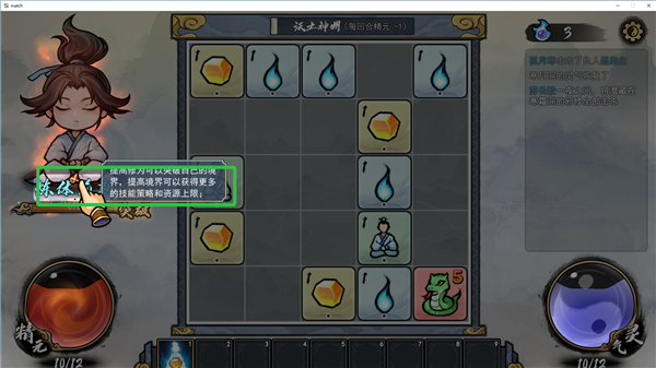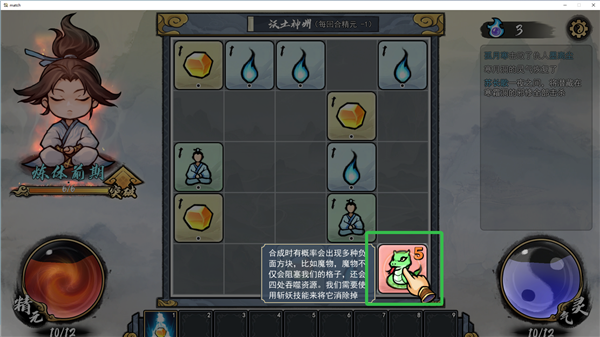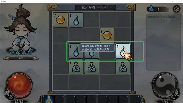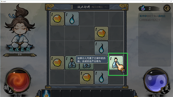 3、合成后的精元资源会聚集起来,每次移动都会消耗精元,精元消耗为0则修行失败。