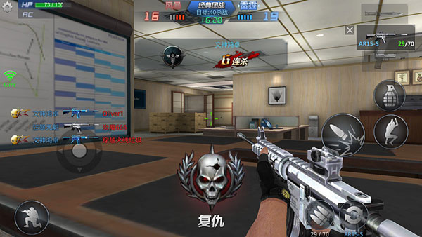 游戏画面左下角有一个圆圈状的虚拟按钮,右下角有个未显示的虚拟按钮,玩家通过滑动虚拟按钮控制人物的动作。其中左下角的虚拟按钮控制移动右下角的虚拟按钮控制准星和射击。同时,在画面左上角设置按钮中有战绩查询、游戏设置、键位设置功能,左下角有蹲下按钮,画面右侧分布有跳跃、切换武器、换子弹、扔手雷等按钮。