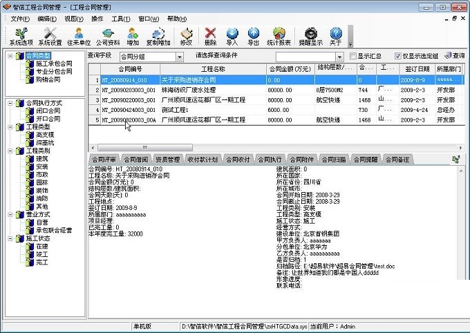 1、建立符合企业实际情况的合同管理体系,软件提供了对工程合同管理过程所涉及的收付款、合同提醒、执行进度、合同附件、执行人员、合同执行等进行科学的调配,最大程度的确保工程合同的顺利实施。2、建立完善的工程合同管理流程,推行阶梯式管理模式,从工程项目部到财务部、及至决策部,都可以根据各自的权限对工程合同执行的各个环节进行日常检视及简单维护,数据共通给企业各部门的工程合同管理提供了极为便利的运作环境。