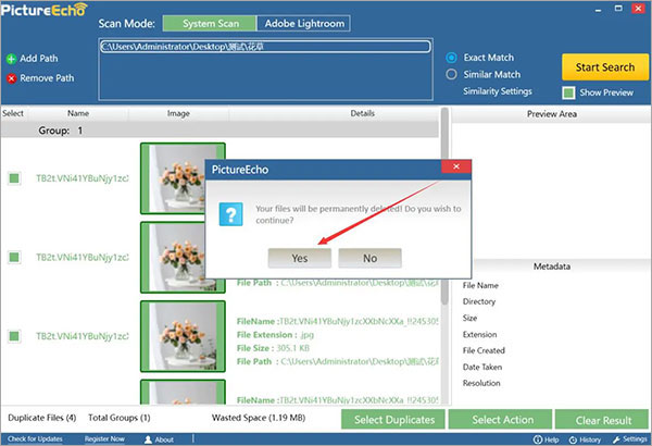 7、最后,会继续弹出如下图窗口提示,我们点击“Yes”按钮,PictureEcho便会执行将重复的图片一并删除的命令;