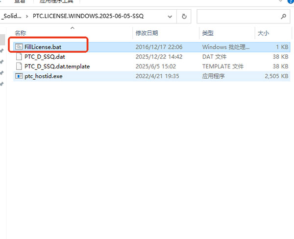 1、从本站下载软件安装文件,解压后,将文件夹“PTC.LICENSE.WINDOWS.2024-05-06-SSQ”复制到临时目录并运行“FillLicense.bat”。批处理脚本附近的“PTC_D_SSQ.dat”文件将生成包含具有正确 PTC HOSTID 的许可证文件
