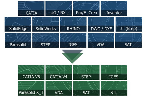 JT,STEP,IGS ,VDA,SAT,X_T,X_B,STL,VRML,PLY,3DS,XGL,OBJ;