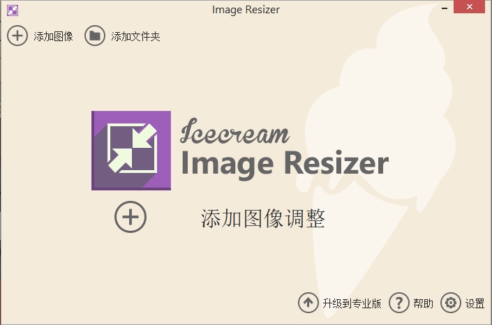 启动程序后,将出现一个加载窗口,后跟程序的主窗口。之后,它将切换到程序的工作区域及其徽标和“添加图像以调整大小”控件-单击它以开始工作。成功添加图像后,主窗口将分为两个部分:左侧的文件队列和右侧的设置(请参阅本手册的“调整大小队列”和“调整大小设置”部分)。