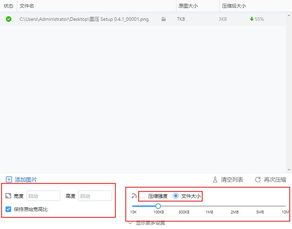 5、软件下方区域可以对图片压缩后的长宽和压缩强度、文件大小进行设置。