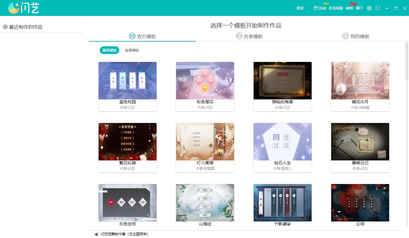 显示闪艺logo,模板管理,高级界面,素材库各大入口栏目。
