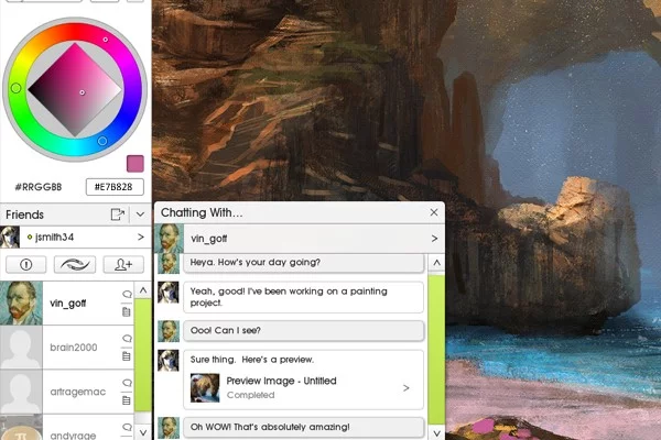 通过 PaintLink 信息服务直接向好友发送 ArtRage 工具、参考图片、颜色集和其他内容,并将收到的内容直接融入绘画中。