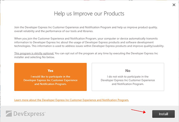 4、选择yes,参加Developer Express Inc的客户体验和通知计划,然后继续安装;