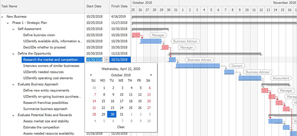我们的WinForms Gantt控件现在支持交互式编辑。用户可以在图表和任务区域中编辑任务。在任务区域中,用户可以调用单元格编辑器来更新任务的开始/结束日期,进度或持续时间。在图表区域中,用户可以通过拖放将任务移至新的时隙,更新进度或更改相关性。图表区域中的更改会自动反映在任务区域中,反之亦然。