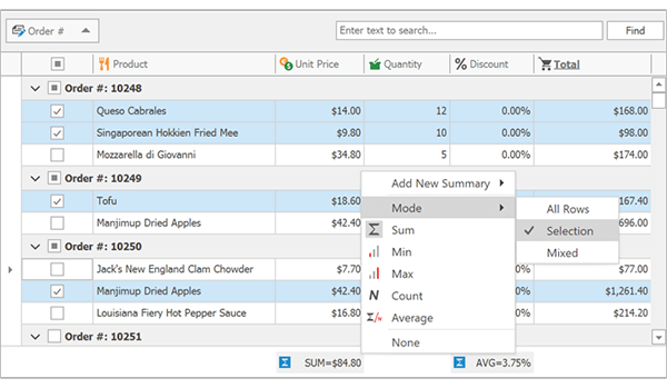在多行选择模式下,我们的WinForms数据网格可以计算选定数据和组行的总计。无论何时更改选择,表格都会自动更新其摘要值。
