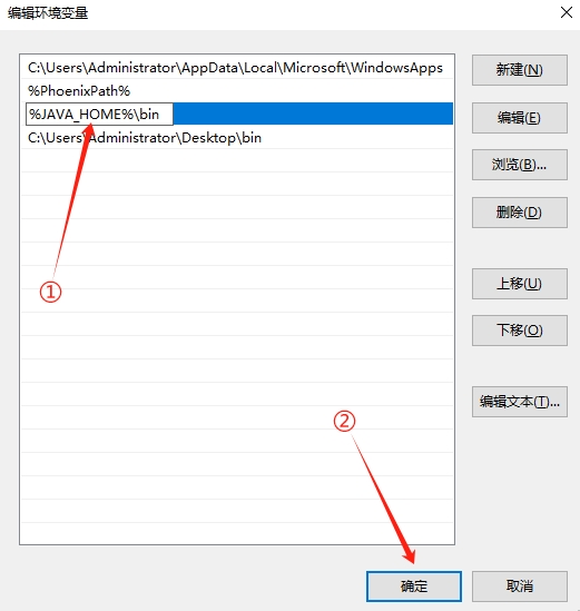 10、变量输入【%JAVA_HOME%\bin】,点击确定。