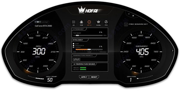 Intelligent模式能让用户简易调整风扇特性。以往的OC软体,用户只能设定固定风扇转速,或进行复杂的自订风扇曲线图。在HOF AI下,用户要改变风扇特性,只需简单使用HOF AI的Intelligent模式。模式预设提供Quiet (宁静)及Performance(性能)选项,能分别提供比默认更宁静及更佳散热效果(详细见上表测试)。另外用户也可自定义风扇倾向安静或性能,幅度由0-50%。